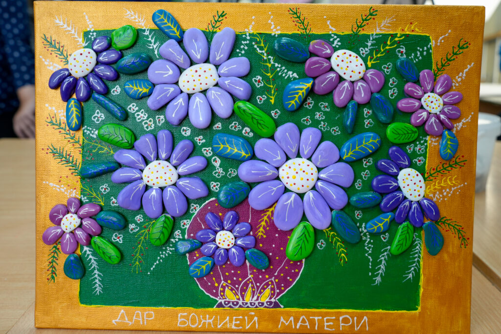 К этому дню готовились и воспитанники Алчевской духовной лечебницы, думая, какой подарок приготовить Царице Небесной, с молитвами и радостью. И решили ребята подарить рождающейся Матери Божией частичку лета, моря, цветов, то есть всего самого лучшего и красивого. Воспоминанием о летнем море послужили морские камушки, которые ребята выкладывали в причудливые добрые картины. А в результате, все согласились, что из этих камушков можно выложить букет цветов, наклеить его на подготовленную основу, красиво разукрасить и подписать: «Дар Царице Небесной». Решили и сделали, с поддержкой и помощью педагога Виктории. А на занятиях мультстудии, запечатлели все свои действия, чтобы получилась маленькая анимационная открытка для дорогой любимой Богородицы, к тому же музыкальная, так как поэтапное преображение камушков в прекрасный неувядающий букет сопровождает песнопение Валаамского хора.
